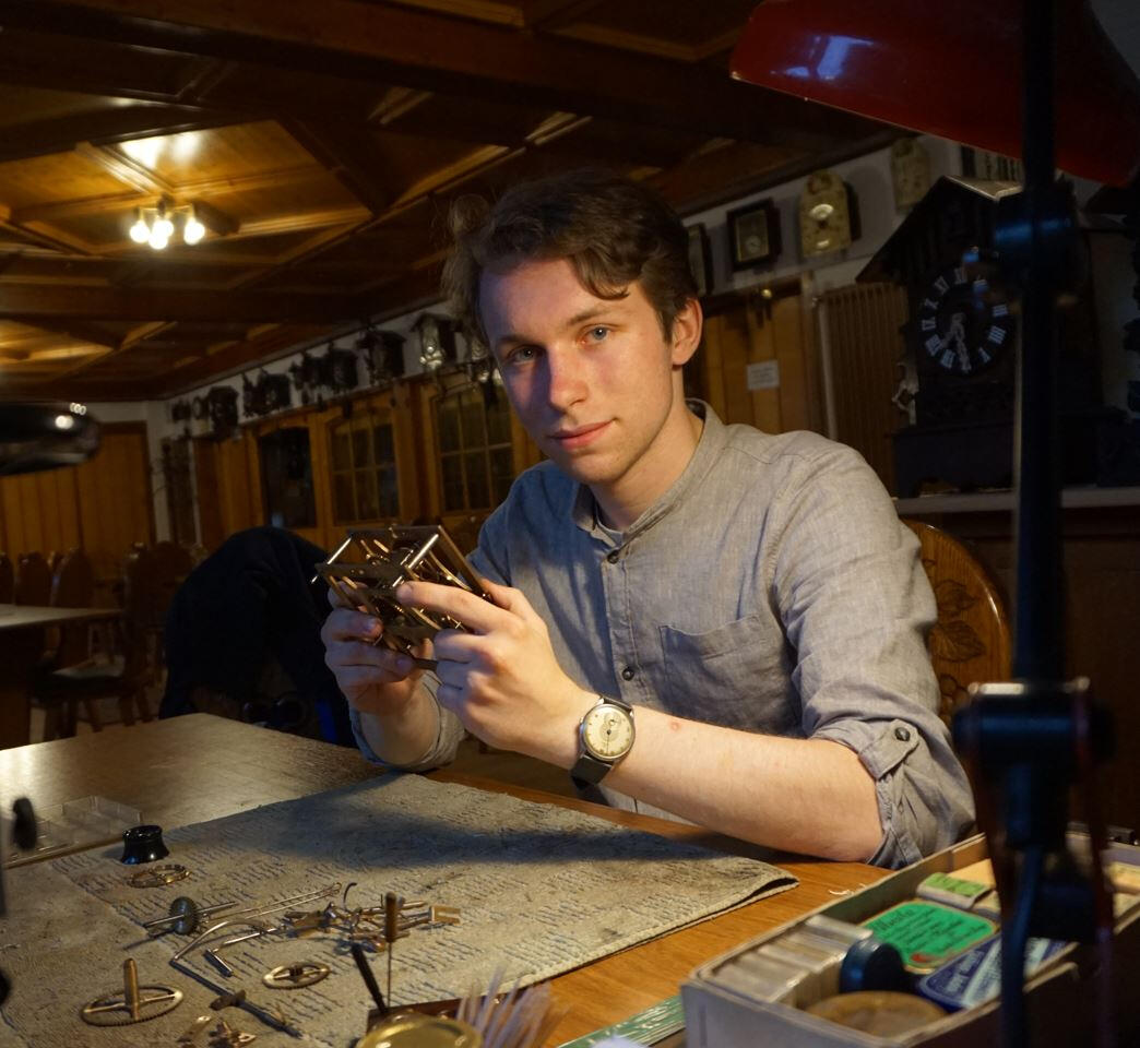 Mein Uhreninteresse begann schon in meiner Kindheit. Neben der Schule lernte ich über Jahre hinweg bei zwei privaten Uhrmachern, kaufte auf Flohmärkten Uhrenfragmente zum Basteln und gewann Erfahrung im Umgang mit Uhrwerken.2014 besuchte ich das erste Mal die Antikuhrenbörse Eisenbach, deren Ausrichtung ich inzwischen übernommen habe. Hier wurde mein Interesse für Schwarzwald- und Kuckucksuhren geweckt und ich erlernte die Feinheiten deren Restaurierung.Mein Produktdesign-Studium war technisch geprägt und die optimale Ergänzung meines Uhreninteresses: Das Praxissemester absolvierte ich bei einer Uhrenfabrik, die auch mein Partner für die Bachelorarbeit wurde.Mittlerweile betreibe ich eine offene Werkstatt im Uhrensaal des Hotel Bad in Eisenbach, einem pittoresken Schwarzwaldort mit reicher Uhrmachertradition. Hier führe ich Komplettrevisionen an allen Arten mechanischer Großuhren von Wecker bis Turmuhr, von antik bis neu durch. Inklusive Lager- und Federtausch, Balgbelederung usw. auch bei komplizierten Werken mit kalendarischen Angaben, Viertelschlag oder Schnecke und Saite.Dank meines großen Ersatzteillagers und Netzes an Sammlern, Händlern und Restauratoren kann ich fast grenzenlos fehlende Teile, Appliken oder ganze Uhren nach individuellen Wünschen vermitteln. Für Beratung, einen Kostenvoranschlag, Verkauf oder der Suche nach etwas ganz Bestimmtem, kontaktieren Sie mich!